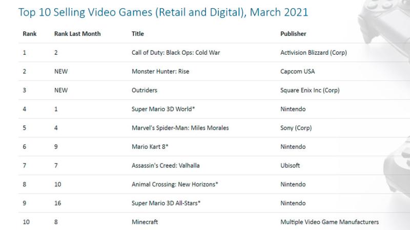 Según un informe elaborado y publicado por The NPD Group, una compañía estadounidense dedicada a la investigación de mercado, Call of Duty: Black Ops: Cold War de Activision Blizzard fue el juego más vendido durante el mes de marzo de 2021, esto considerando tanto compras digitales como físicas de retail.