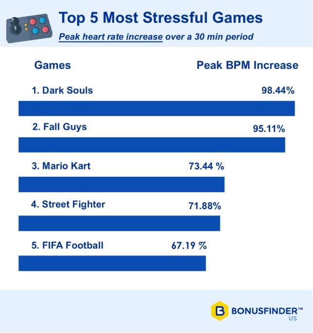 Pese a estos resultados, los cuales evalúan la frecuencia media en cada sesión de juego, el juego más estresante en un momento único no podía ser otro que Dark Souls III. Los expertos que analizaron el comportamiento de los jugadores afirman que “los juegos en línea y para un jugador que tienen rondas de eliminación, jefes finales y picos de dificultad aumenta al máximo las pulsaciones por minuto, produciendo el momento más estresante”.