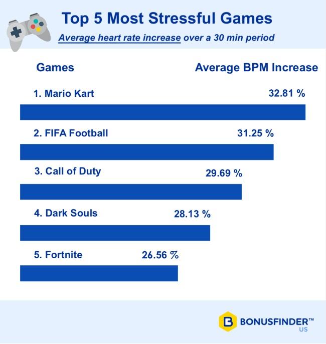 Los resultados pueden ser bastante sorprendentes; pues en un periodo de 30 minutos de juego o más el juego más estresante es Mario Kart. Aquí el estudio detalla que “Las frecuencias cardíacas se elevaron en promedio 21 BPM (pulsaciones por minuto), lo que representa un aumento del 32,81% en el promedio de la frecuencia en reposo”.