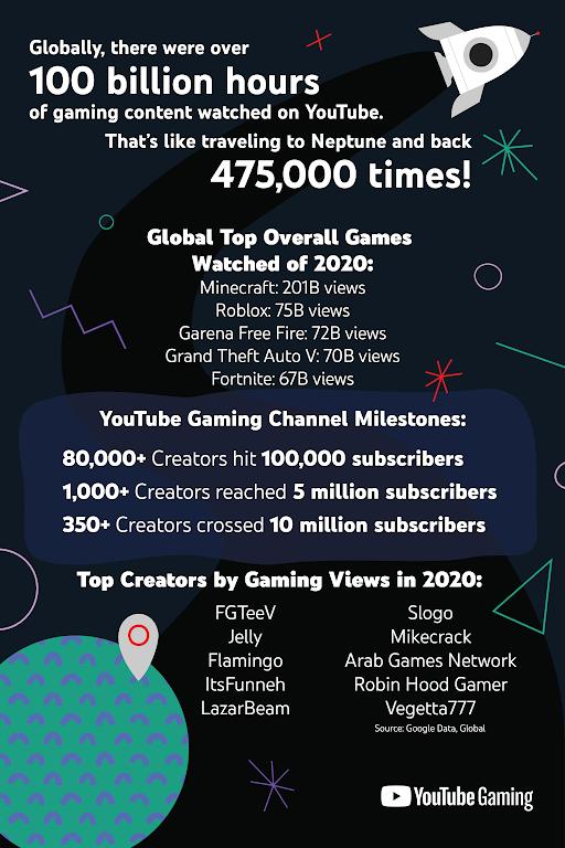 Youtube reporta un total de 100 mil millones de horas de video reproducidas dentro de YT Gaming. El TOP 5 sorprendentemente no está liderado por un Battle Royale: Minecraft sigue siendo el rey y justifica su posición como el juego más vendido de la historia con un total de 201.000 millones de visualizaciones.