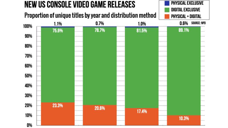 Sin embargo, lo más llamativo es que el porcentaje de juegos que reciben un lanzamiento exclusivamente digital asciende hasta el 90%, dejando apenas un 10% de lanzamientos para el formato físico, frente al 23% que alcanzaban en 2018.
