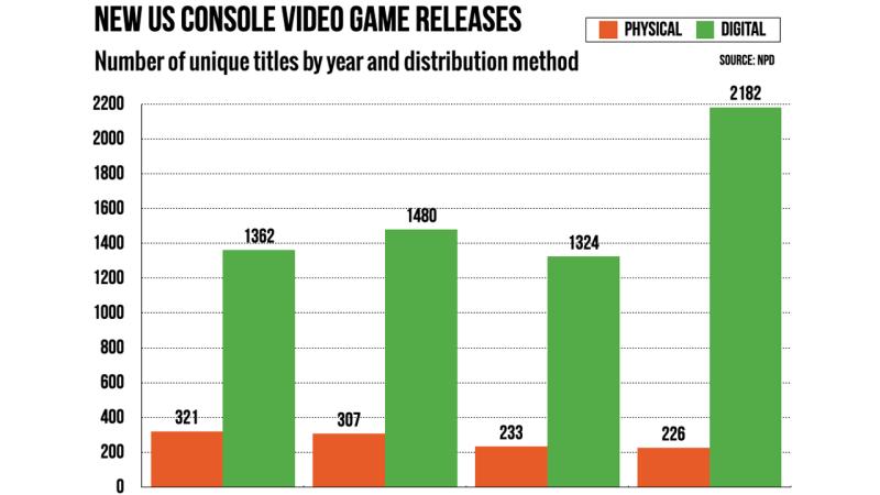 Más allá del evidente aumento de consumo en formato digital, hay una reducción significativa de juegos distribuidos en formato físico. Solo en Estados Unidos, los juegos nuevos disponibles en físico pasaron de 321 en 2018 a 226 en 2021, una reducción de casi un 30%.