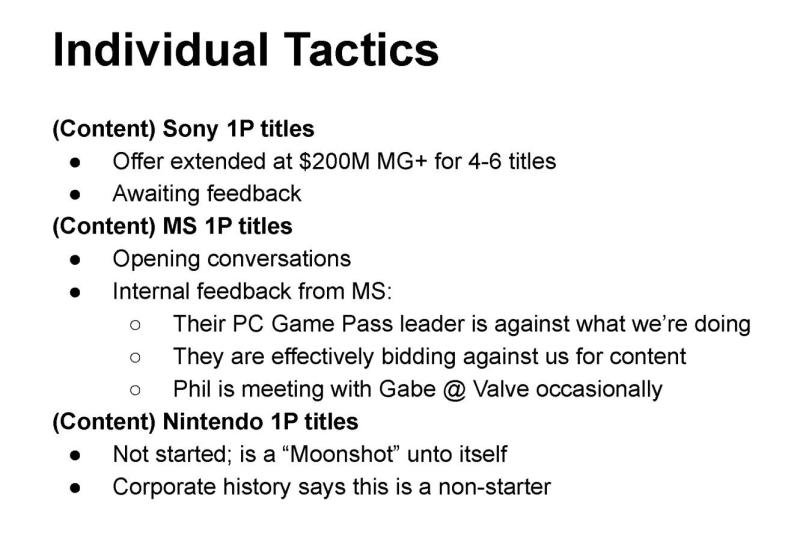 Por el lado de Xbox, se indica que Epic estuvo en conversaciones con Phil Spencer, jefe de la división de juegos de Microsoft, pero tras la revelación del proyecto Xbox Game Pass, algo contrario al modelo de negocios dentro de Epic Games.