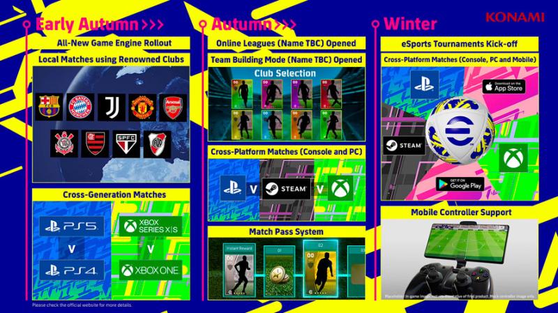En cuanto al futuro a largo plazo de la franquicia, Kimira confirma que Konami dejará de lanzar ediciones anuales, ya que el modelo free to play les permite actualizar el juego de forma gratuita para cada temporada, por lo que todo estará disponible dentro de los servidores. Inicialmente, eFootball solo traerá partidos amistosos, pero se añadirán diferentes modos de juego con la llegada de actualizaciones y DLCs.