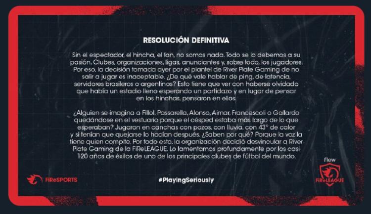 Posteriormente Fire League eliminó el tweet y publicó unas disculpas, afirmando que de todas formas River Plate Esports sería descalificado.