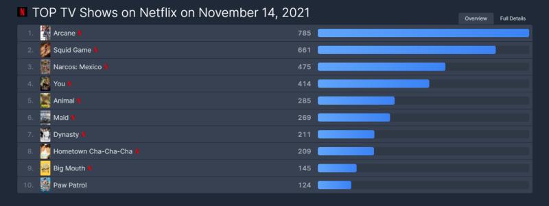 La serie no deja de ganar popularidad y ya alcanzó el primer lugar de Netflix en 52 países alrededor del mundo, tras el lanzamiento del segundo acto, según informó FlixPatrol. Arcane ya se posicionaba como una de las producciones más importantes el fin de semana anterior, donde dominó las listas de 38 países con el primer acto.