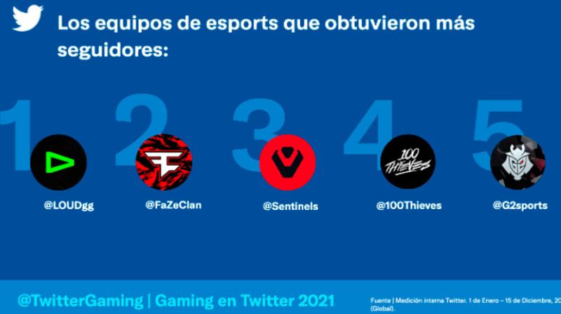 Dentro de la misma categoría pero ahora apuntando a los equipos de Esports que obtuvieron más seguidores en Twitter durante 2021, LOUD Esports sigue en el primer lugar seguidos de FaZe Clan, mientras que cerrando el podio asoma Sentinels, el club norteamericano que fue derrotado por KRÜ Esports en el Valorant Champions.