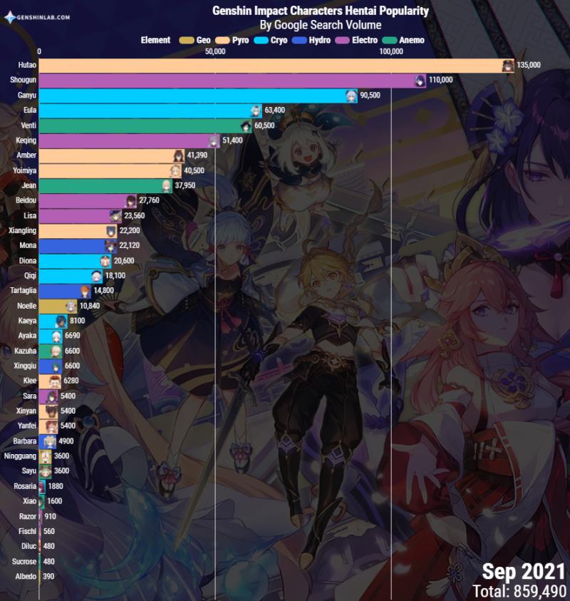 Lo que sucede es que Genshinlab recopiló en un gráfico el número de veces que usuarios de Internet buscaron contenido para adultos -ya sea pornografía o hentai- relacionado con Genshin Impact, exponiendo una gráfica entre los personajes más buscados a lo largo de la trayectoria del juego, desde septiembre de 2020 hasta septiembre de 2021.
