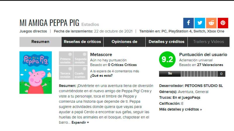 Al entrar en Metacritic, podemos encontrar que My Friend Peppa Pig cuenta con una nota de 9.2 sobre 10, superando ampliamente a Far Cry 6 con un 4.7, Battlefield 2042 con un 3.0 y GTA: The Trilogy con un 0.9, este último convirtiéndose en uno de los peores estrenos del año.