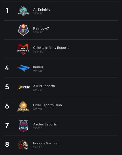 Esto significa que de los 8 equipos, solo cinco seguirán compitiendo y All Knights, Infinity Esports, Rainbow7, Isurus Gaming y XTEN, quienes tendrán que demostrar todo su nivel para enfrentar la siguiente etapa y luchar por un cupo en la Final.