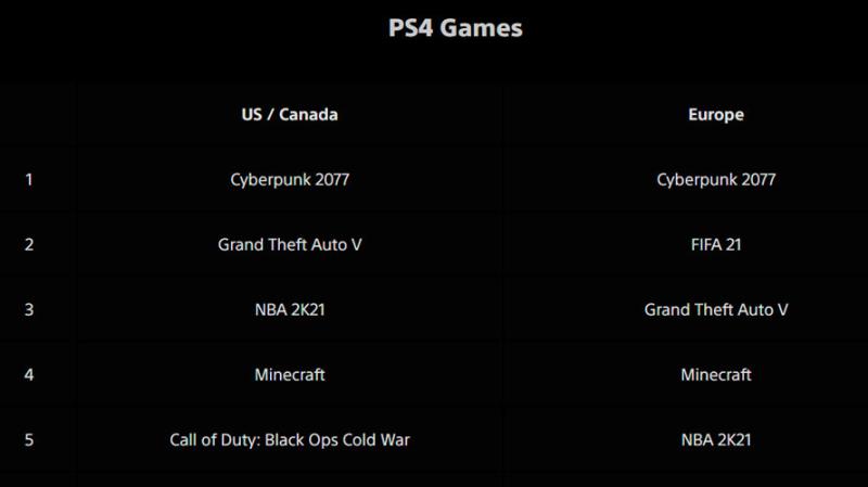 Si bien Sony no publica los datos exactos, podemos ver que el juego de CD Projekt se ubica en primer lugar tanto en América como en Europa, superando a los que siempre gobiernan el listado, como GTA V, Minecraft o FIFA 21. El dato es aún más destacable cuando recordamos que solo estuvo disponible entre el 21 y 30 de junio en la PS Store, posicionándose ahí en menos de 10 días.