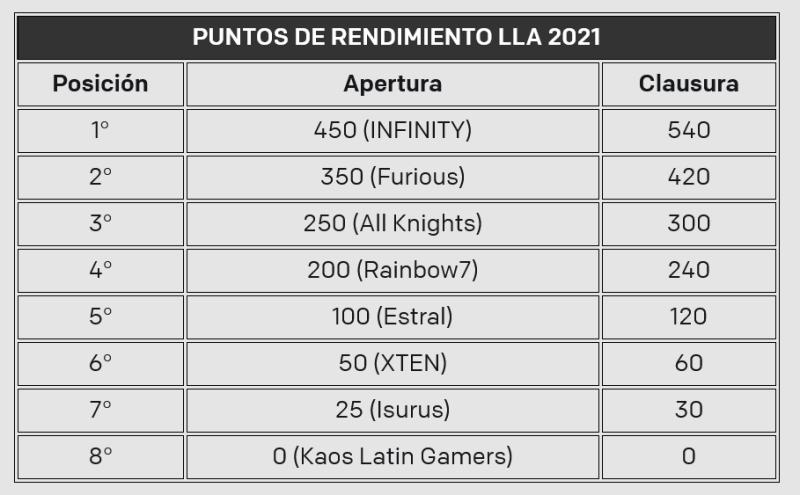 Es así que Furious Gaming, quién terminó entre los dos últimos del torneo 2020 y Undead Gaming, campeón de LVP, tienen su cupo asegurado en la Promoción y Relegación. A ellos se sumarán los peores de la LLA en la presente temporada y los campeones de las ligas nacionales de Norte y Sur a finales de septiembre.