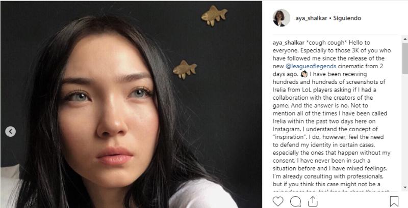 “Hola todos, en especial a los 3 mil que me empezaron a seguir desde el lanzamiento de la nueva cinemática de @leagueoflegends hace 2 días. He recibido cientos y cientos de capturas de pantallas de Irelia por parte de jugadores de LoL que me preguntan si tuve alguna colaboración con los creadores del juego. La respuesta es no […] Entiendo el concepto de “inspiración”. Sin embargo, siento la necesidad de defender mi identidad en ciertos casos, especialmente en los que ocurren sin mi consentimiento. Nunca antes he estado en una situación así y tengo sentimientos encontrados. Ya estoy consultando a profesionales, pero si también crees que este caso no es una coincidencia, siéntete libre de compartir esta publicación y etiquetar a @leagueoflegends o @riotgames para apoyarme. Gracias”