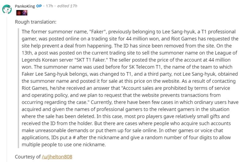 Este jugador tuvo la idea de subastar el nombre de invocador en una página surcoreana, poniéndole un precio de 44 millones de wones, lo que equivale a unos $28 millones de pesos chilenos. Cualquiera que pague este precio podrá quedarse con el nick.
