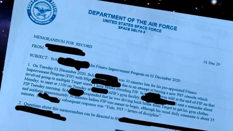 Este aviador de 1era Clase retrocedió hasta el rango de Aviador Senior por culpa de esta transgresión, y al ser contactado por sus superiores para que se presentara a la clase respondió “Yolo, PS5 > Cartas de disciplina”, haciendo alusión a que solo se vive una vez. La imágen a continuación sería el parte que le entregaron al piloto.