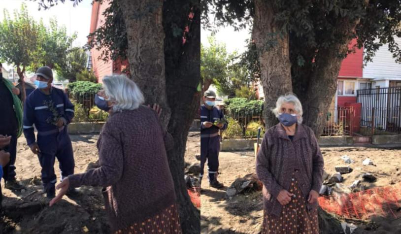 Una mujer de unos 80 años, identificada como Margarita, se aferró a un árbol alcornoque en el sector Higueras de Talcahuano, con motivo de impedir que lo talen para pavimentar el sector, lo que finalmente terminó consiguiendo.