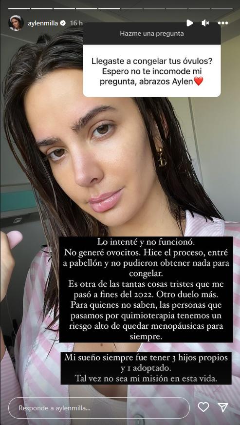 Aylén Milla contó entonces su intento por congelar óvulos, lo que finalmente no resultó: "Lo intenté y no funcionó. No generé ovocitos. Hice el proceso entré a pabellón y no pudieron obtener nada para congelar".