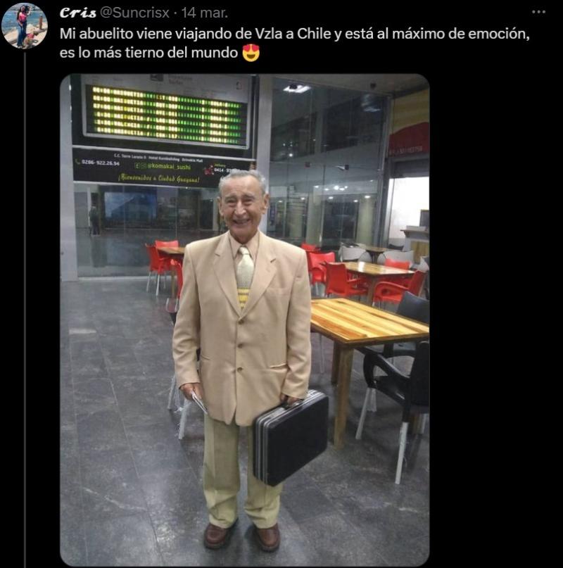 Un hombre de 90 años decidió prepararse como se debe y se puso su traje más elegante para venir a visitar a su nieta venezolana que reside en Chile, indica UPSOCL.