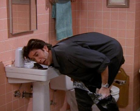 Cabe recordar que en la escena recordada por Fran García Huidobro, el personaje de Ross Geller (David Schwimmer) usó pantalones de cuero para una cita, pero, debido al calor que le ocasiona la prenda, decide quitárselos en el baño de su acompañante, siendo una tarea imposible.
