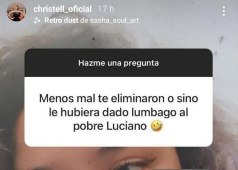 En ese plano, este fin de semana Christell no quiso dejar pasar un mal comentario: "Menos mal te eliminaron o sino le hubiera dado lumbago al pobre Luciano". Al cual sólo contestó con un "Ok" en sus historias.