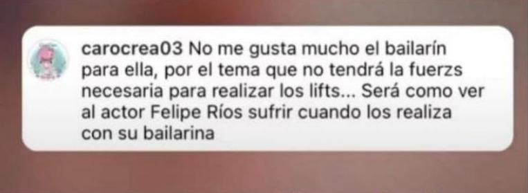 Asimismo, Christell adjuntó otro comentario realizado por otro hater, donde señalaba que no creía que Luciano Coppelli fuera el bailarín idóneo para ella, porque no podría realizar los lifts en competencia.