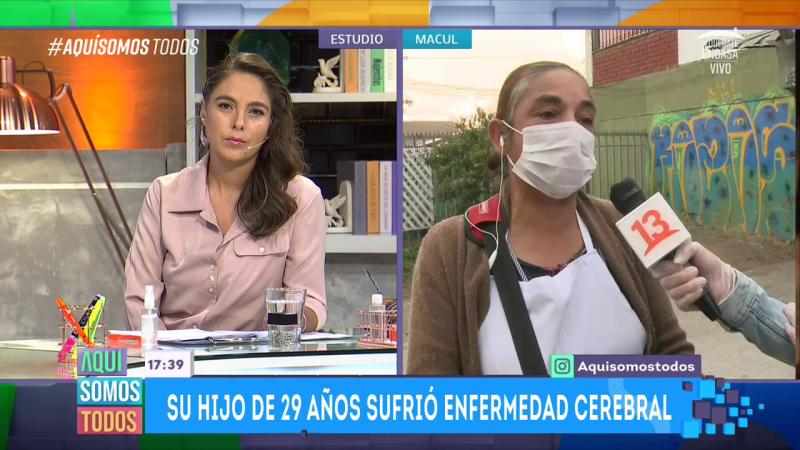 En “Aquí Somos Todos” nos conmovimos profundamente cuando conocimos a Ximena, una madre de la comuna de Macul que sale a la calle, día tras día, para ganarse su sustento con el que alimenta a su hijo, Javier, de 29 años de edad, que sufre de una enfermedad cerebral. La protagonista de este caso, Ximena, aseguró que: “Con este virus uno no puede ni abrazar a las personas, ni estrecharles la mano. Al menos yo con mi hijo sí porque, si alguna vez tenemos que enférmanos; si nos vamos a morir, que nos vamos los dos al tiro de un viaje. ¿Para qué lo voy a dejar en este mundo?”