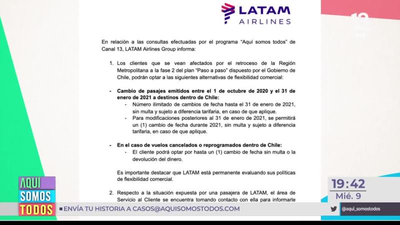 Para responder a esta inquietud, en Aquí Somos Todos conversamos con el Subsecretario de Economía Julio Pertuzé. “Con respecto a las devoluciones, la ley del consumidor es bastante clara, y tal como lo decía el director del Sernac, lo primero que corresponde es que la empresas se contacten con los consumidores, les expliquen cuáles son las condiciones y les ofrezcan alternativas. ¿Cuáles pueden ser esas alternativas? Yo imagino que (a quien) va a ver a su familia, le puede servir una reprogramación, porque va a poder volver a ver a sus seres queridos una vez que la región metropolitana pase a fase 3”, señaló la autoridad.