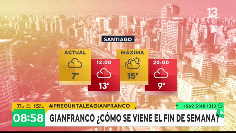 A 15 grados llegará la máxima hoy en Santiago, con una baja probabilidad de precipitaciones, por lo menos hasta el viernes de la próxima semana.