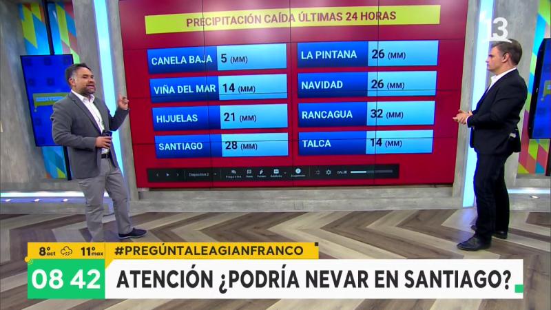 Según lo pronosticado lloverá hasta mañana en la zona central. En Santiago hasta ahora han caído 28 milímetros, las temperaturas estarán entre los 8 y 11 grados.