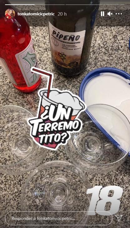 Además, mostró en su mano una copa de un clásico terremoto, y en sus historias cómo preparó el dulce trago clásico de las fiestas patrias, mostrando el pipeño que se usa como base, el helado de piña y la granadina para dar el toque dulce.