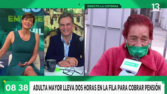 Zoila Contreras de 77 años tiene movilidad reducida y una úlcera cancerosa, lleva dos horas haciendo una fila en Intermodal de La Cisterna para poder cobrara su pensión, tiene dos hijas, pero no se ocupan de ella por lo que debe hacer la mayoría de sus trámites sola.