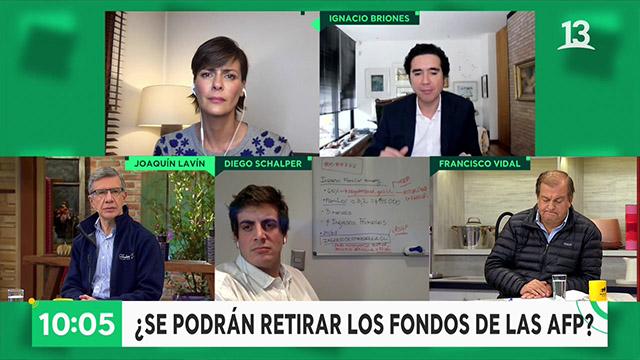 Tonka le preguntó al ministro sí era posible el retiro los fondos de las AFP como lo hicieron en Perú, sobre este asunto Briones comentó “yo sé que no es políticamente correcto ni muy popular decirlo pero, no tengo ningún problema con la popularidad, no la ando buscando, a mí me parece una mala idea, porque nosotros llevamos años discutiendo, como uno de los pilares fundamentales, que tenemos pensiones bajas y tenemos un problema social importante donde hemos avanzado, subimos la pensión básica solidaria pero tenemos un desafío gigante respecto al pilar contributivo”
