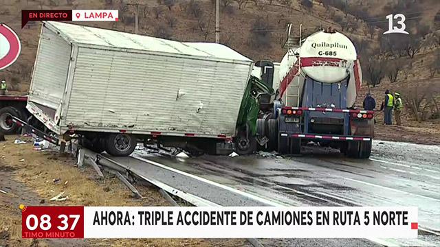Esta mañana nuestro reportero Leo Castillo fue hasta la Ruta 5 norte en Lampa en las cercanías de la cuesta El Manzano, fue a reportear un accidente ocurrido a las 6 am en donde un camión perdió el control e impactó a dos vehículos menores, lamentablemente dejó un fallecido.