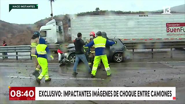 Mientras el periodista y el camarógrafo se encontraban registrando las imágenes del accidente, fueron testigos de otra colisión entre 3 vehículos, dos camiones impactaron a un vehículo menor que quedó en medio de las máquinas.