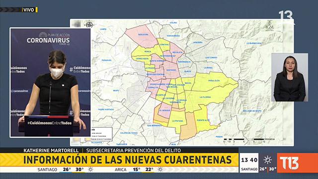 Las nuevas comunas que entran en cuarentena son: Cerro Navia, Conchalí, La Cisterna, La Florida, La Granja, Lo Espejo, Lo Prado, Macúl, Peñalolén, Renca, San Joaquín y San Miguel