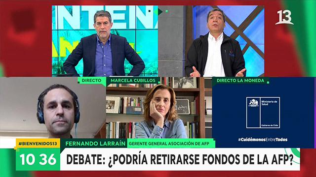 Francisco Vidal estuvo de acuerdo con lo expuesto con Larraín, sin embargo, acotó que “la única alternativa es poder sacar, por ejemplo, 300 lucas mensuales por 4 meses, ya, 1 millón 200 mil pesos, pero que el estado le devuelva a ese ciudadano en el tiempo lo que ese ciudadano sacó para cubrir la emergencia, siempre y cuando no haya otras ayudas.”