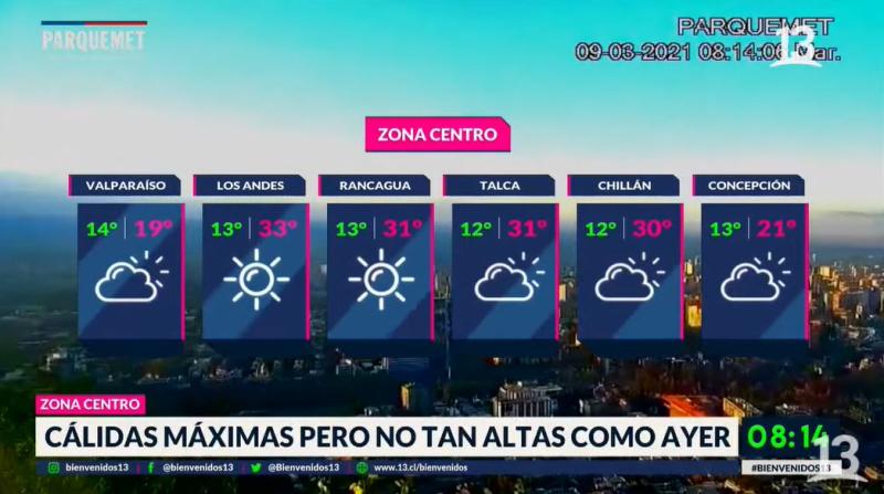 Asimismo, nuestro meteorógolo este martes arrancó con 13°C comenzó la mañana de este martes 9 de marzo en Santiago, mientras que en la tarde la temperatura llegará hasta los 31°C, 33°C en Colina, bajo un cielo despejado. Asimismo la gran noticia es que a partir de este miércoles bajarán las temperaturas en el país.