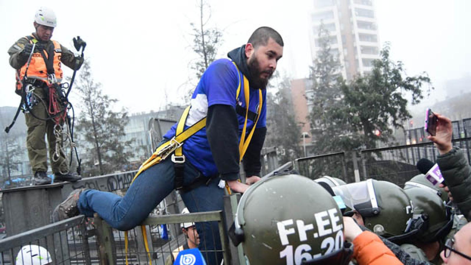 Con incidentes entre jóvenes y Carabineros se desarrolló una protesta de estudiantes de la Universidad Iberoamericana en plena Autopista Central altura puente Manuel Rodriguez, donde uno de ellos trepó a una de las señaléticas de la vía. El periodista Andrés Herrera estuvo en el lugar y conversó con uno de los dirigentes.