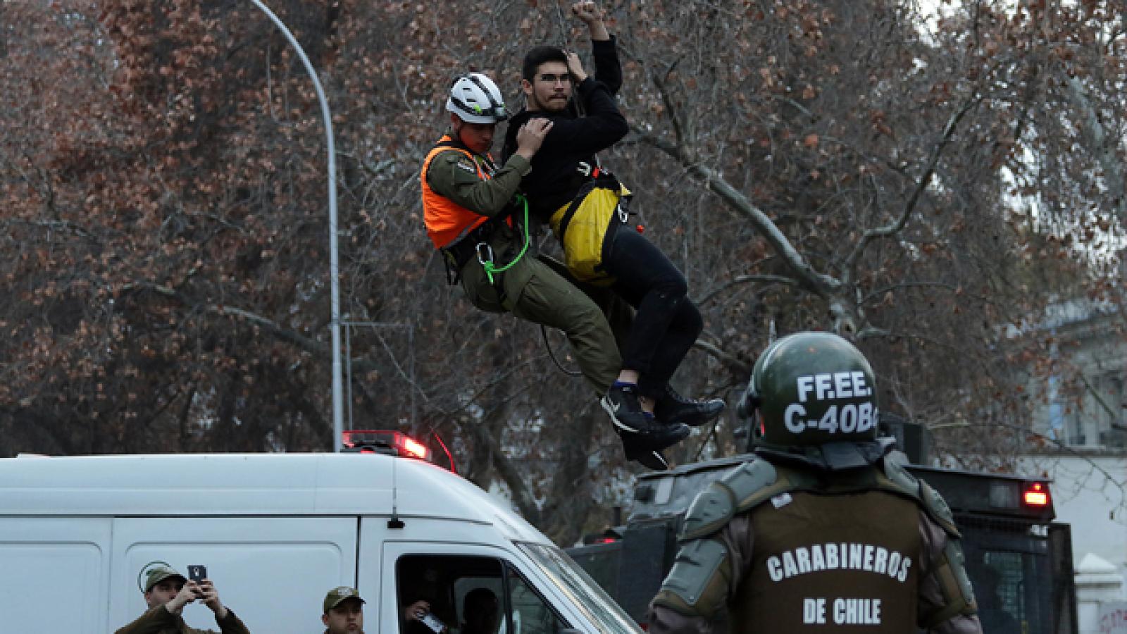 Desde muy temprano un grupo de jóvenes se tomó esta principal arteria de la comuna de Santiago para protestar por el nuevo Estatuto Laboral Joven, anunciado hace unas dos semanas por el Gobierno. Luego algunos manifestantes se subieron a una señalética para desplegar un lienzo, lugar hasta donde llegó Carabineros.