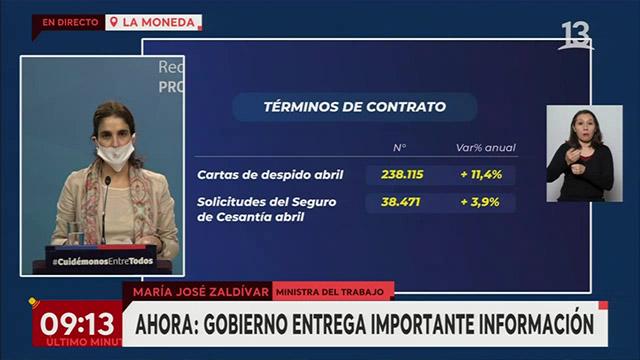 Esta mañana la ministra María José Zaldivar, realizó un reporte en donde habló de las cartas de despido, las solicitudes del seguro de cesantía y la aplicación de la ley de protección al empleo.