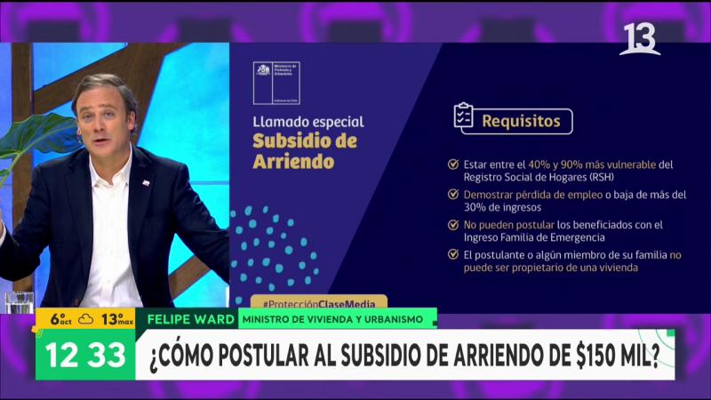 Tras el paquete de medidas de protección a la clase media difundido este fin de semana por el Gobierno, el Ministro de Vivienda y Urbanismo, Felipe Ward, explicó en detalle cómo postular al nuevo subsidio de arriendo.