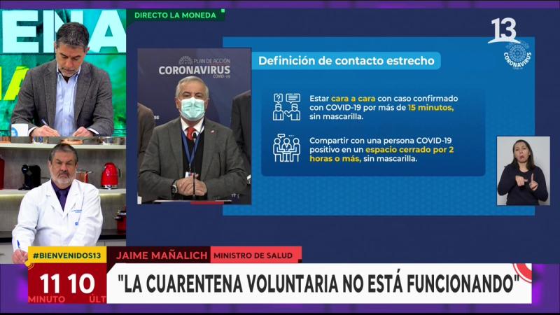 Antes del reporte diario de casos Covid-19 en Chile, el Ministro de Salud, Jaime Mañalich, anunció que se publicó en el Diario Oficial un nuevo decreto para definir los días de cuarentena y lo que se considera un caso estrecho.