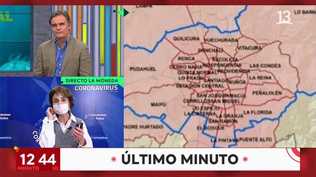 “hoy día se determinó que a partir del día viernes a las 22 horas se va a decretar cuarentena para las comunas de la provincia de Santiago que son 32 y también, otras 6 comunas que se suman a la cuarentena, también se decretó un cordón sanitario en San Antonio y la salida de algunas comunas de cuarentena: Arica, Osorno y Chillán” declaró la subsecretaria.