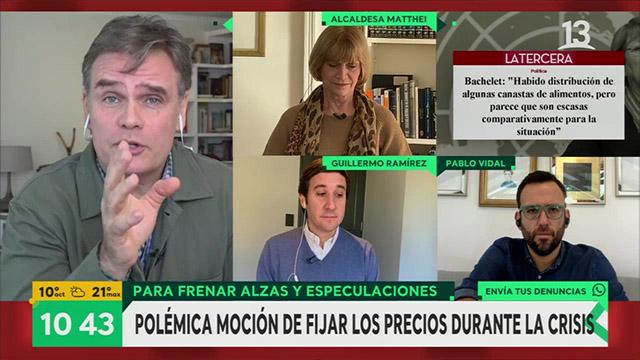 Nuestro animador Amaro Gómez-Pablos trajo a colación la polémica que ha generado la propuesta de algunos alcaldes de fijar los precios a los alimentos básicos y se lo planteó a nuestros panelistas invitados la alcaldesa Matthei y los diputados Guillermo Ramírez y Pablo Vidal.