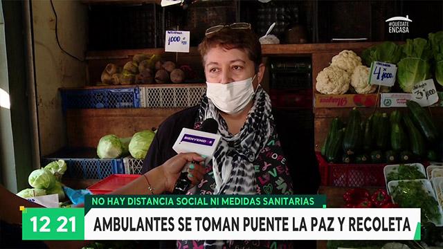 En plena cuarentena en la zona norte de Santiago Centro, los comerciantes ambulantes se siguen instalando en el puente Recoleta y La Paz, sin importarles nada, no respetan la distancia entre ellos y algunos si siquiera respetan las medidas de seguridad sanitaria.