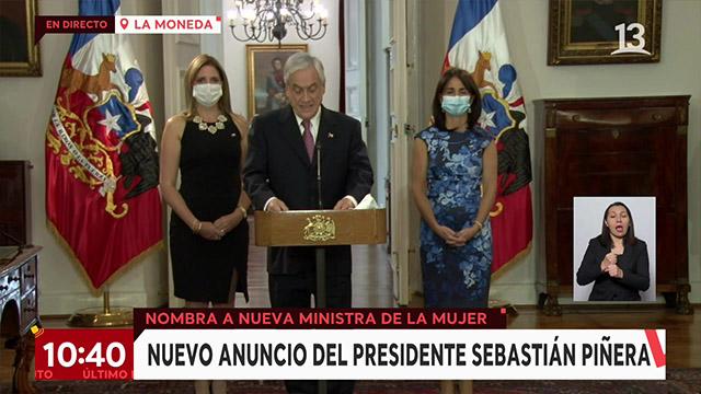 Macarena Santelices asumirá la cartera luego de la renuncia de Isabel Plá el 13 de marzo. Santelices es periodista de profesión y exalcaldesa de Olmué, puesto al que renunció el 2019 para luchar por un cupo de Gobernadora Regional por la UDI, partido en el que milita. Por el lado de su madre tiene un parentesco con Augusto Pinochet siendo su sobrina nieta.