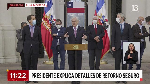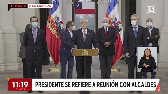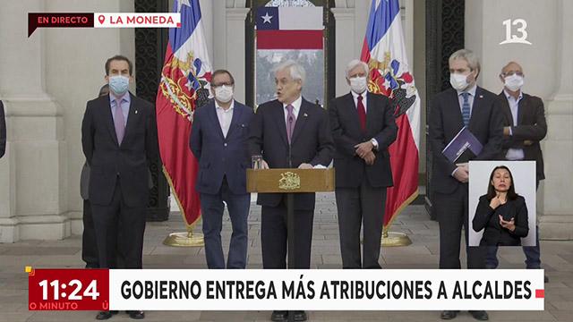 “En primer lugar, vamos a firmar hoy día un decreto que aumenta sustancialmente las capacidades de fiscalización de los funcionarios municipales para fiscalizar las condiciones sanitarias, el cumplimiento de las cuarentenas, el toque de queda” Declaró Piñera.