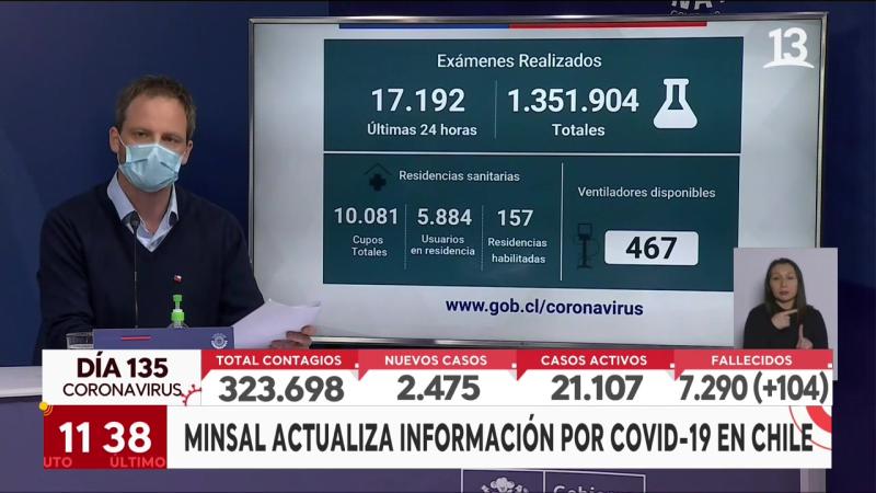 De acuerdo a lo informado esta mañana por el Subsecretario de Redes Asistenciales, Arturo Zúñiga, este jueves 16 de julio se registraron 2.475 nuevos casos de Covid-19 en nuestro país, sumando un total de 323.698 contagiados.