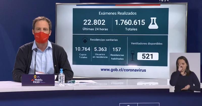 Además se informó que existe un total de 521 respiradores disponibles y 10.764 cupos totales en residencias sanitarias.