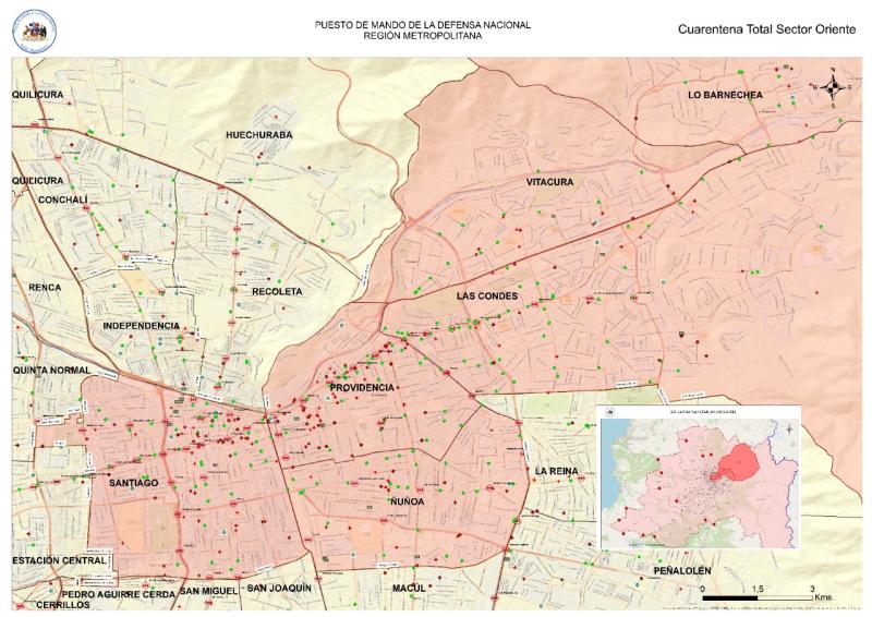 - Las 6 comunas en cuarentena de la región Metropolitana: Los Barnechea, Santiago, Ñuñoa, providencia, Las Condes y Vitacura mantiene ese estado hasta el lunes a las 5 am.